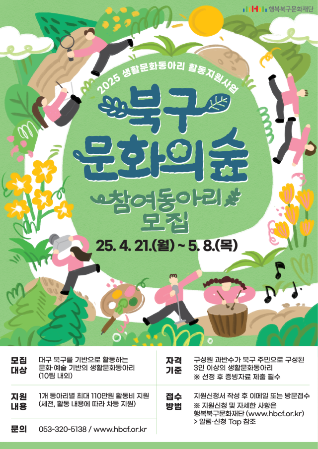 행복북구문화재단은 대구 북구 지역 생활문화 활성화를 위해 '북구 문화의 숲' 사업에 참여할 생활문화동아리를 21일(월)부터 5월 8일(목)까지 모집한다.