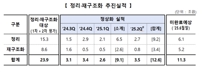이후 1년간 금융당국과 업계가 건전성 회복을 위해 노력했고, 지난 3월말까지 9조1천억원이 정리됐다. 금감원은 6월까지 3조5천억원이 추가로 정리돼, 총 12조6천억원의 정리·재구조화가 이뤄질 것으로 예상했다. 전체 중 절반 이상에 해당하는 52.7%의 부실 PF가 정리되는 것이다.