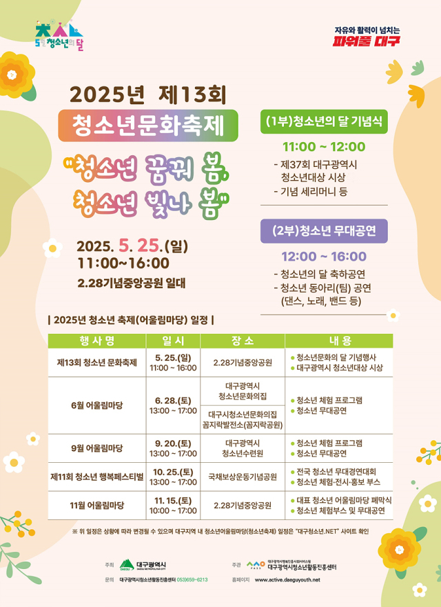 대구시는 25일 오전 11시 2·28기념중앙공원에서 '2025년 제13회 청소년문화축제'를 개최한다고 22일 밝혔다.