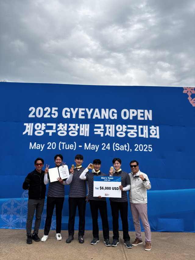 26일 예천군에 따르면 지난 23일 인천 계양구 아라온 수향원에서 열린 '2025 계양구청장배 국제양궁대회(Gyeyang Open)' 남자 단체전에서 예천군청 실업양궁팀이 금메달을 목에 걸었다.