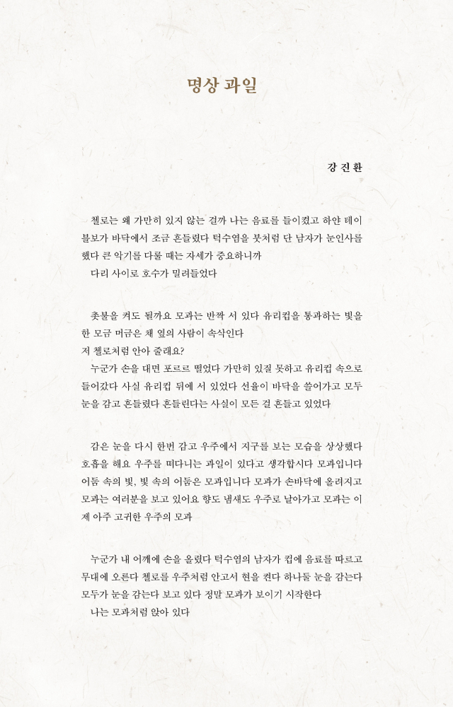 심사위원장 이태수 시인은 "'명상 과일'은 무심히 지나가는 일상을 절대적인 시간으로 바꾸는 감각을 보여줬으며, 존재의 예감을 언어로 구현해냈다"며 "평범한 순간을 특별하게 바라보는 창작자의 태도가 작품에 잘 드러났다"고 평했다. 또한, "비록 경험의 질감에 일부 아쉬움은 있었지만, 순간의 깊이를 음악과 정물이 가진 존재론적 긴장으로 풀어낸 점에서 높은 점수를 받았다"고 덧붙였다.