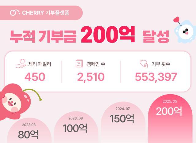 국내 최초 블록체인 기반 기부 플랫폼 '체리'(CHERRY)가 누적 기부금 200억원을 돌파하며 투명한 기부문화를 선도하고 있다.