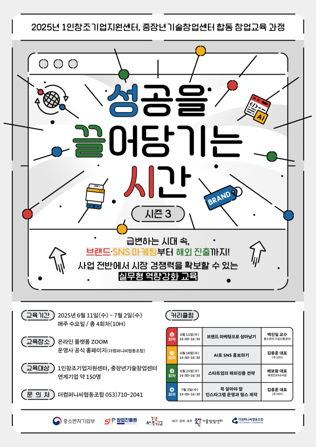 2023년부터 시작해 올해로 3년 차를 맞이한 '성.끌.시 시즌3'는 1인 창조기업 및 중장년 기술 창업센터 연계 기업 약 150명을 대상으로, 총 4회에 걸쳐 브랜드·SNS마케팅부터 해외 진출 전략까지 실무형 창업역량 강화를 중점으로 진행된다. 교육 주제는 △브랜드 마케팅 △AI를 활용한 SNS 홍보 △스타트업 해외진출 전략 △인스타그램 운영 및 릴스 콘텐츠 제작으로 구성됐다.(세부 내용은 포스터 참고)