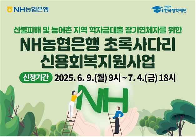 한국장학재단(이사장 배병일)은 NH농협은행(은행장 강태영)의 기부금을 활용한 'NH농협은행 초록사다리 신용회복지원사업'을 오는 9일부터 시행한다.