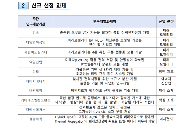 정부는 후보기업으로 선정된 기업에 앞으로 4년간 총 342억원 규모(기업당 평균 34억원) 연구개발(R&D) 자금을 지원한다. 이를 바탕으로 제일연마공업은 미래 모빌리티 EV 모터 핵심부품 초정밀 가공용 연삭 휠 시리즈 개발 과제를 수행할 예정이다. 에이치에너지는 실시간 전력시장을 위한 소규모 분산 자원 플랫폼 기술 및 사업화 R&D를 맡는다.