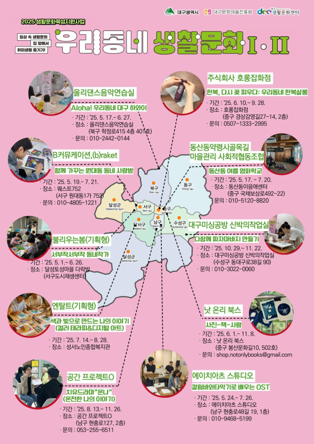 이번 사업은 문예진흥원의'생활문화육성지원사업'에 선정된 대구광역시 중구, 서구, 남구, 북구, 수성구, 달서구에 위치한 10개의 생활문화 공간에서 추진돼 시민들의 일상 속 활동 거점을 활성화하는 것이 특징이다.