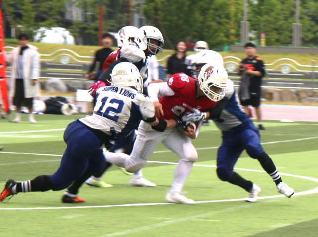 ▲ 동국대 리시버 이강호(88)가 14일 군위 종합구장에서 열린 대구경북 대학 미식축구 춘계리그 2부 경기 도중 돌파를 시도하다 계명대 수비 이준성(12)에게 저지당하고 있다. 대구경북 미식축구협회 제공