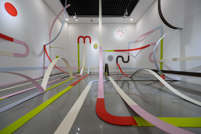 하지원은 평면 회화를 해체하고 재조합하는 과정을 통해 예측 불가능한 조형 언어를 탐색하고 있는 작가다. 이번 전시의 출품작 ‘롤러코스터’(2025)는 육아의 일상에서 비롯된 감각과 경험을 바탕으로 한 설치 작업이다. 아이의 놀이에서 느껴지는 반복과 즐거움의 리듬을 공간 전체에 드로잉하듯 표현한 작품이다.