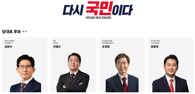 ▲주진우 의원이 탈락하고, 김문수 안철수 조경태 장동혁 4인의 후보가 당 대표 본선에 진출했다. 국민의힘 홈페이지.