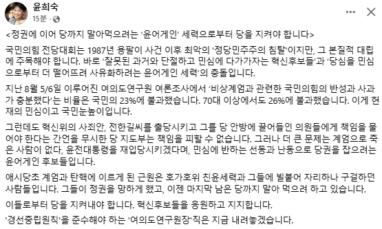 윤희숙 위원장은 이어진 페이스북 글에서 "지난 8월 5~6일 이뤄진 여의도연구원 여론조사에서 '비상계엄과 관련한 국민의힘의 반성과 사과가 충분했다'는 비율은 국민의 23%에 불과했다. 70대 이상에서도 26%에 불과했다. 이게 현재의 민심이고 국민 눈높이"라고 설명했다.