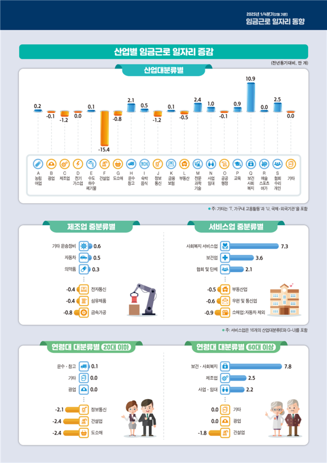 산업대분류별로는 보건·사회복지업이 10만9천개 늘어나며 증가를 주도했다. 이 중 사회복지서비스업이 7만3천개, 보건업이 3만6천개 각각 증가했다. 협회·수리·개인서비스업(2만5천개)과 전문·과학·기술서비스업(2만4천개)도 늘었다.
