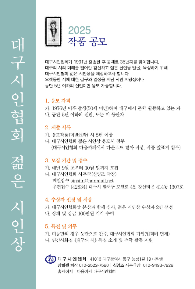 한편, 1991년 출범해 올해로 35주년을 맞은 대구시인협회(회장 장하빈)는 대구 시문학의 미래를 열어갈 참신하고 젊은 신인을 발굴하기 위해 이번 상을 제정했다.
