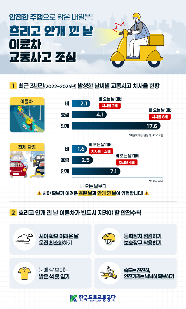 교통사고분석시스템(TAAS)에 따르면 최근 3년(2022~2024년) 간 안개 낀 날과 흐린 날 발생한 이륜차 교통사고 치사율은 17.6, 4.1로 각각 나타났다. 이는 비 오는 날 대비 각각 8배, 2배에 달하는 수치다.