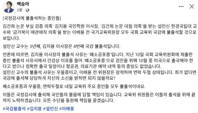 백승아 의원은 13일 오후 6시 31분쯤 페이스북에 글을 올려 "'김건희 논문 부실 검증 의혹' 관련 김지용 국민학원 이사장, '김건희 논문 대필 의혹'을 받는 설민신 한경국립대 교수, '금거북이 매관매직 의혹'을 받는 이배용 전 국가교육위원장 모두 국회 교육위 국감에 불출석할 것으로 보인다"고 전했다.
