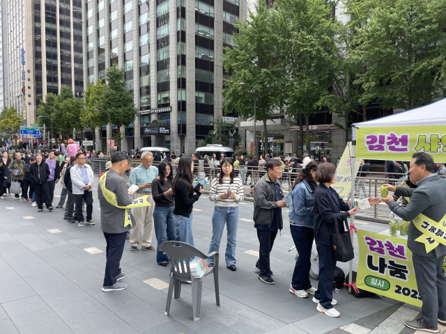 흐리고 간간이 비가 내리는 날씨에도 3천여명의 서울 시민과 외국인 관광객이 김천의 명품 샤인머스켓을 맛보기 위해 긴 줄을 섰다.