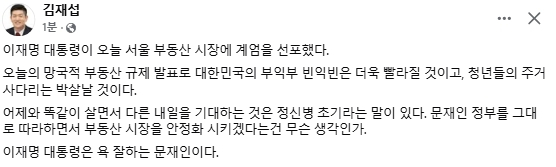 이에 대해 김재섭 의원은 당일 오전 10시 45분쯤 페이스북에 올려 '부동산 계엄령'이라는 취지의 표현을 하면서 "오늘의 망국적 부동산 규제 발표로 대한민국의 부익부 빈익빈은 더욱 빨라질 것이고, 청년들의 주거 사다리는 박살날 것"이라고 전망했다.