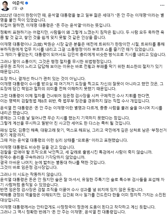 한편, 김재섭 의원의 "이재명 대통령은 욕 잘하는 문재인"이라는 표현은 이준석 개혁신당 대표가 이틀 전인 12일 오후 10시 25분쯤 페이스북에 적은 "이재명 대통령은 돈 주는 윤석열"이라는 표현을 패러디한 것인지 시선이 향한다.