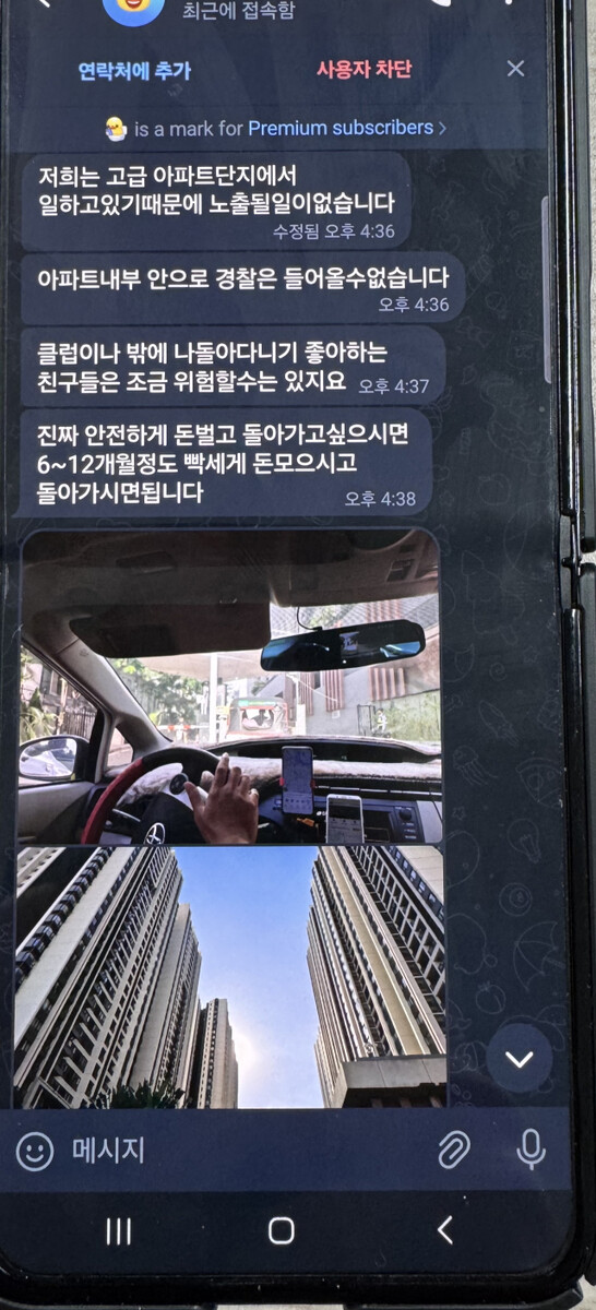 현지 취재를 통해 입수한 텔레그램 대화 캡처에 따르면, 이들 조직은 아파트단지 내에서 여전히 감금과 사기 행위를 지속하면서도 "저희는 고급 아파트단지에서 일하고 있기 때문에 노출될 일이 없습니다. 아파트 내부 안으로 경찰은 들어올 수 없습니다"라며 안심시켰다.